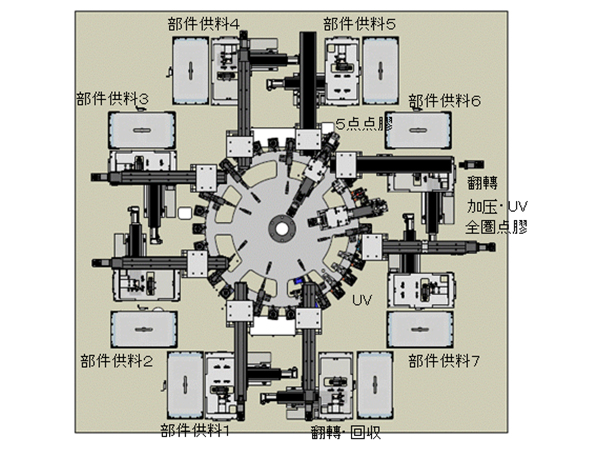 由彈匣供料各鏡頭部件(鏡片)進行組裝・膠水塗膠・UV硬化,托盤収納的設備。