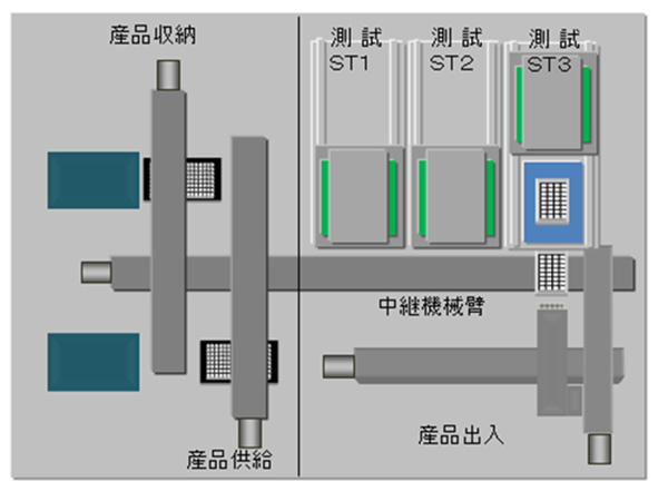 氣壓傳感器的溫度特性檢查設備。產品由托盤供料,160個単位檢查後,収納托盤,NG BOX選擇進行回収。