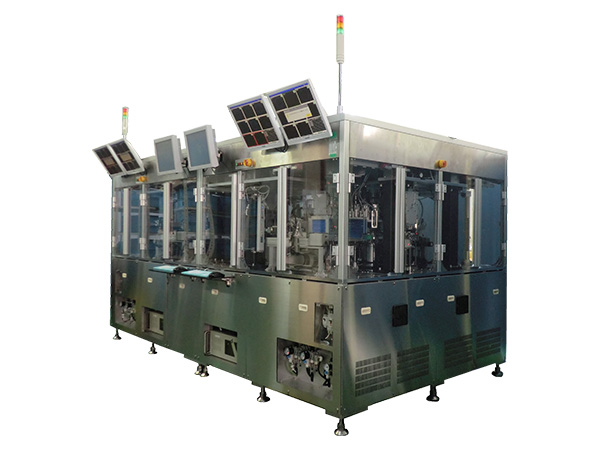 - 有冶具托盤順序進行,同時處理每個過程。組件供料→加壓・高度測試→正面和背面翻轉(堆疊組裝時)→組件位置確認(CCD相機)→膠水塗膠→部件搭載→加壓・UV照射,高度測試→UV照射(預硬化)→組件位置確認(CCD相機)→膠水一周塗膠→UV照射(主硬化)→膠水狀態確認(CCD相機)→組件収納→NG排出・清掃→殘留檢知確認(CCD相機)