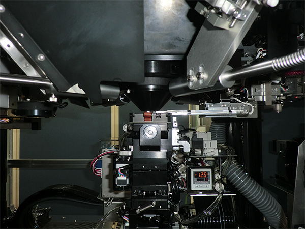 This machine mounts the lens unit to the sensor substrate which are supplied via special trays. It performs focus adjustment, temporary bond curing, and storing under automated opearions. Enables user to adjust forcus with a high degree of accuracy via 6-axis alignment functions.