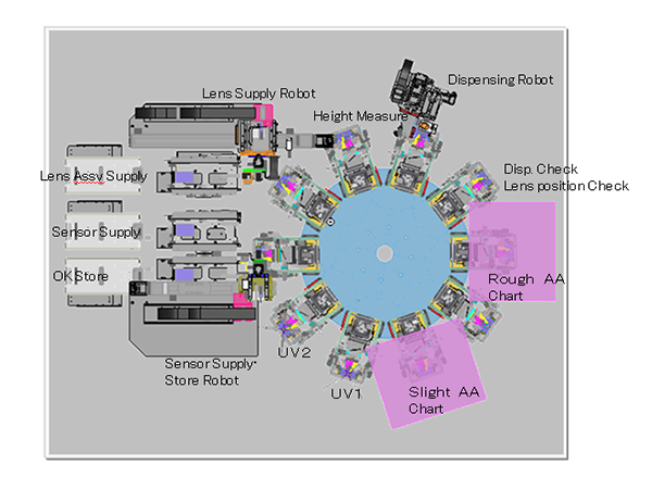 - By parallelizing main processes such as supply sensors, dispensing bond, Rough_AA, Slight _AA, UV irradiation 1, UV irradiation 2, and storing, performs efficient operations with composing the minimum alignment stage.