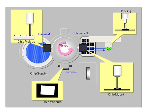 - Performs bond dispensing, dispensing inspection, and loading of IC tips continuously at the same stage, Thus shortening the operation time from dispensing to loading. This is perfect for die bonding on using bond which dries easily.
