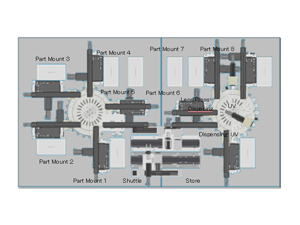 This machine assembles lens parts, dispenses bond, and performs UV curing, all of which have been supplied by magazines. It then stores them into trays.