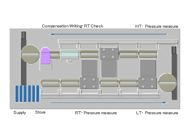 This machine inspects and adjusts output characteristics of TPMS sensor under temperature condition.