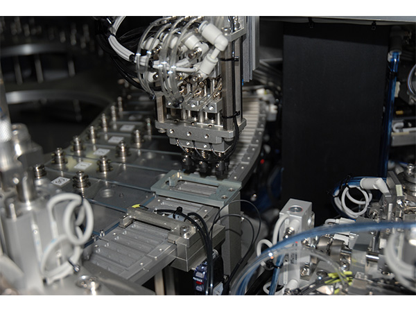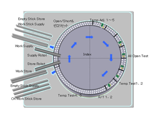 This machine performs Open/Short & Zero reset, temperature characteristics adjustment (5-point), all open, and normal temperature inspection, for the high accuracy RTC products. It stores them automatically after sorting them into the good products, the products to be re-inspected, and NG products.