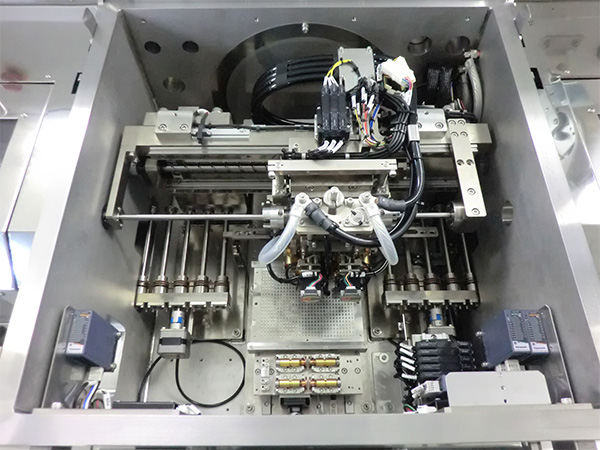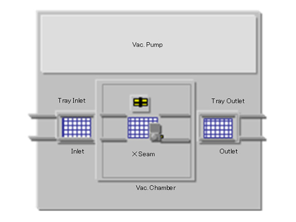 This machine performs X-axis seam welding on proudcs following the welding of the Y-axis of the lid under vacuum atmosphere. This machine is also equipped with an automated exchanging device for roller electrodes.