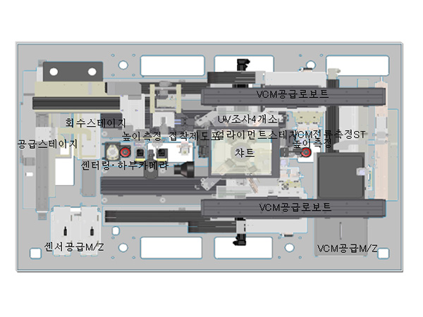 전용트레이로 공급된 센서기판에 렌즈유니트를 조립하고, 포커스조정, 접착제가경화, 수납까지 자동으로 실시하는 장비입니다.6축얼라이먼트기구로 고정도로 포커스조정이 가능합니다.