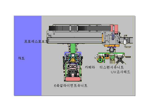 센서기판에 렌즈유니트를 조합하여, 포커스조정후, 접착제의 가경화를 실시하는 장비입니다. 6축의 얼라이먼트기구로 고정도로 포커스조정합니다.