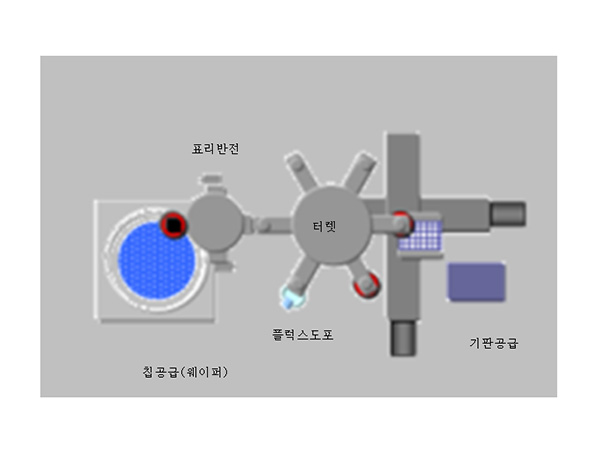 웨이퍼에서 반전 픽업한 IC칩을 TCXO패키지에 탑재하는 장비입니다.