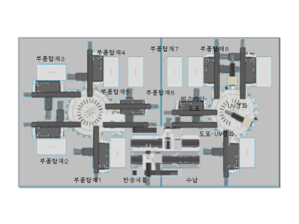 매거진으로 공급된 각 렌즈 부품의 조립・접착제도포・UV경화를 실시한후, 트레이에 수납하는 장비입니다.