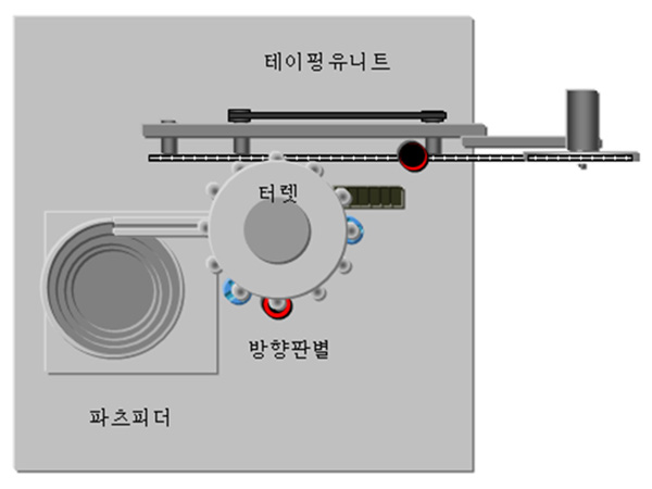 파트 피더에서 취출한 워크를 엠보스 테이프에 수납하는 장비입니다.