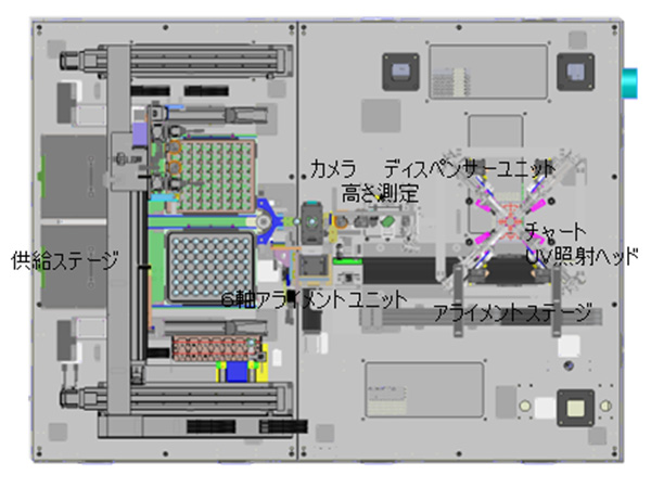 専用トレイで供給されるセンサ基板にレンズユニットを組み付け、フォーカス調整、接着剤仮硬化、収納までを自動で行う装置です。6軸のアライメント機構で高精度にフォーカス調整を行うことができます。