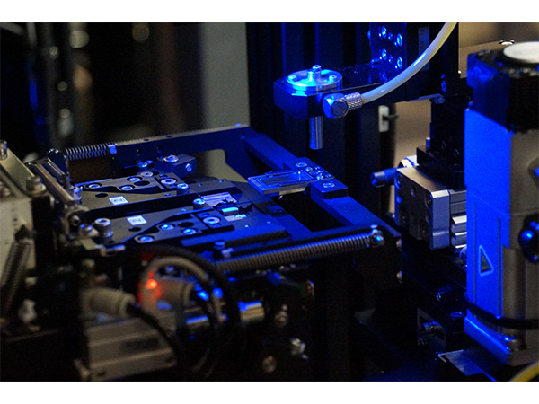 インデックステーブル上の6軸アライメントユニットでCMOSセンサとレンズAssyのフォーカス調整、光軸調整を行い、UV照射により接着を仮固定する装置です。