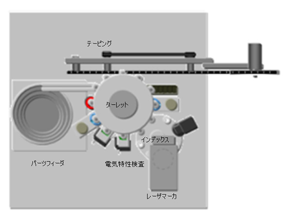 TCXOの電気特性検査、マーキング、テーピングをターレット搬送により高速に行う装置です。