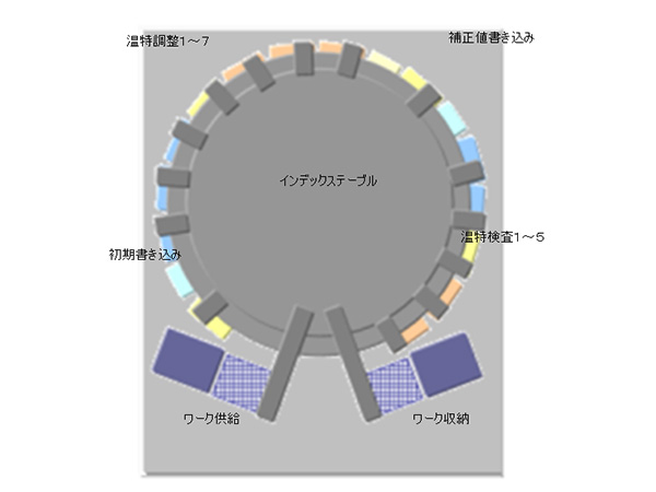 | システム構成 | ST1:初期検査 ST2~8:ADJ1~7 (低温ST.×3、+25℃、高温ST3) ST9:ROM 書込み ST10~14:TC test1~5 (低温ST×2、+25℃、 高温ST×2) |