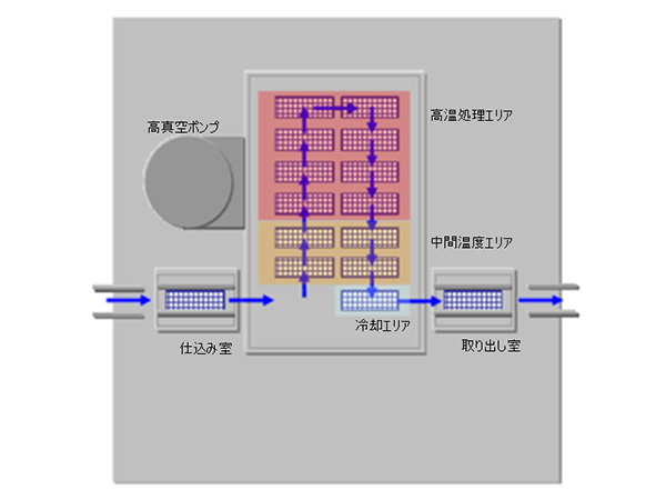 リッド仮付けまたはシーム溶接工程の直前に真空アニールを行う装置です。溶接工程の処理速度に合わせ、キャリア毎にアニール処理(枚葉式処理)することを可能としました。