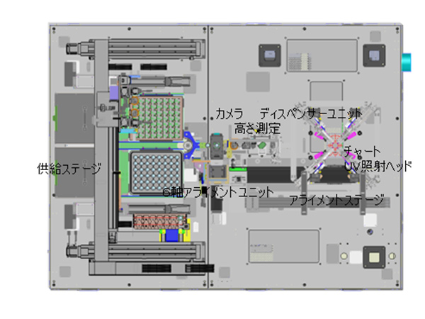 専用トレイで供給されるセンサ基板にレンズユニットを組み付け、フォーカス調整、接着剤仮硬化、収納までを自動で行う装置です。6軸のアライメント機構で高精度にフォーカス調整を行うことができます。